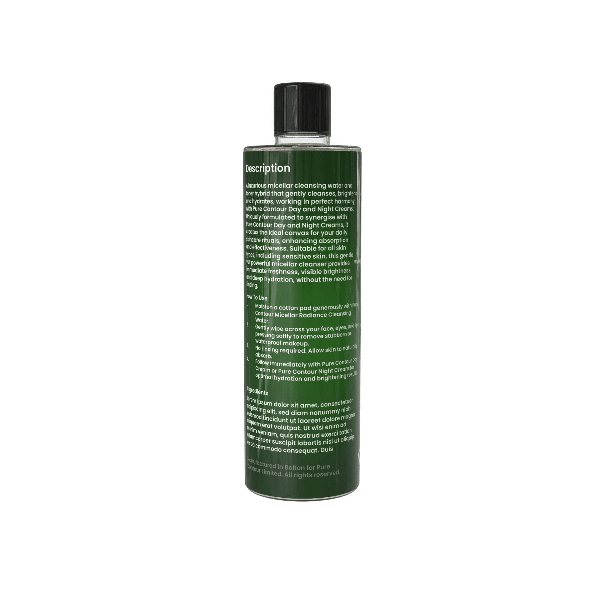 - Generously moisten a cotton pad with Pure Contour Micellar Radiance Cleansing Water.