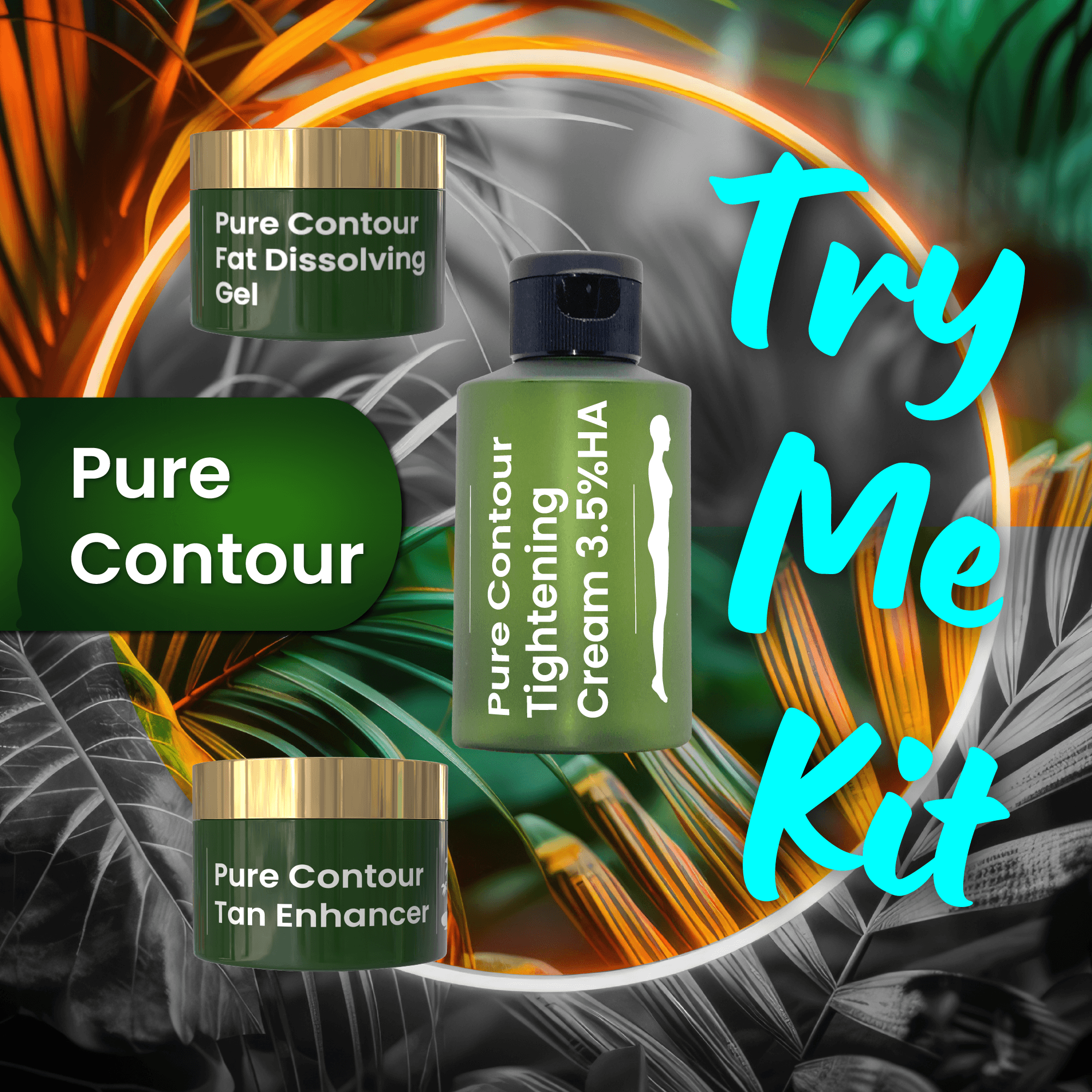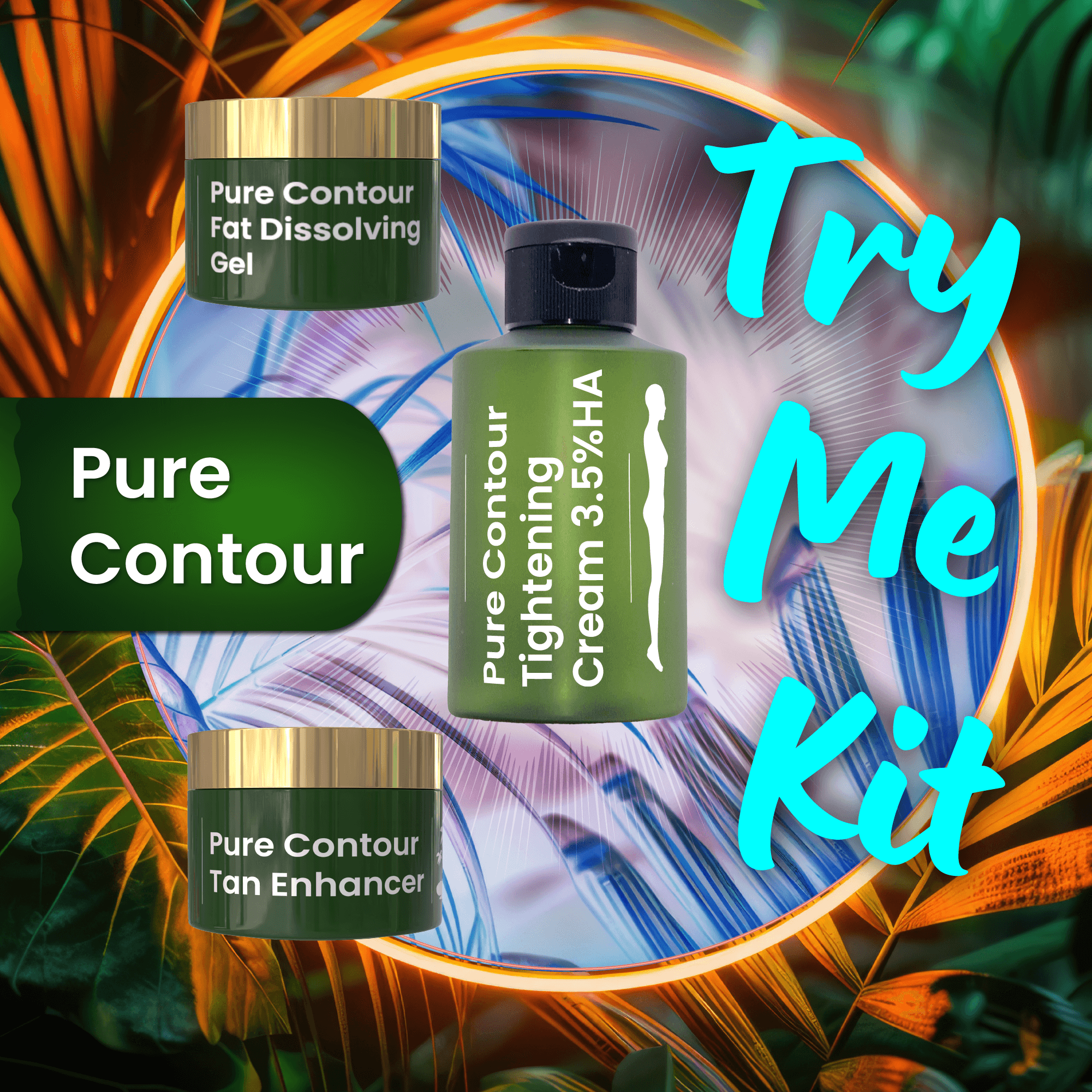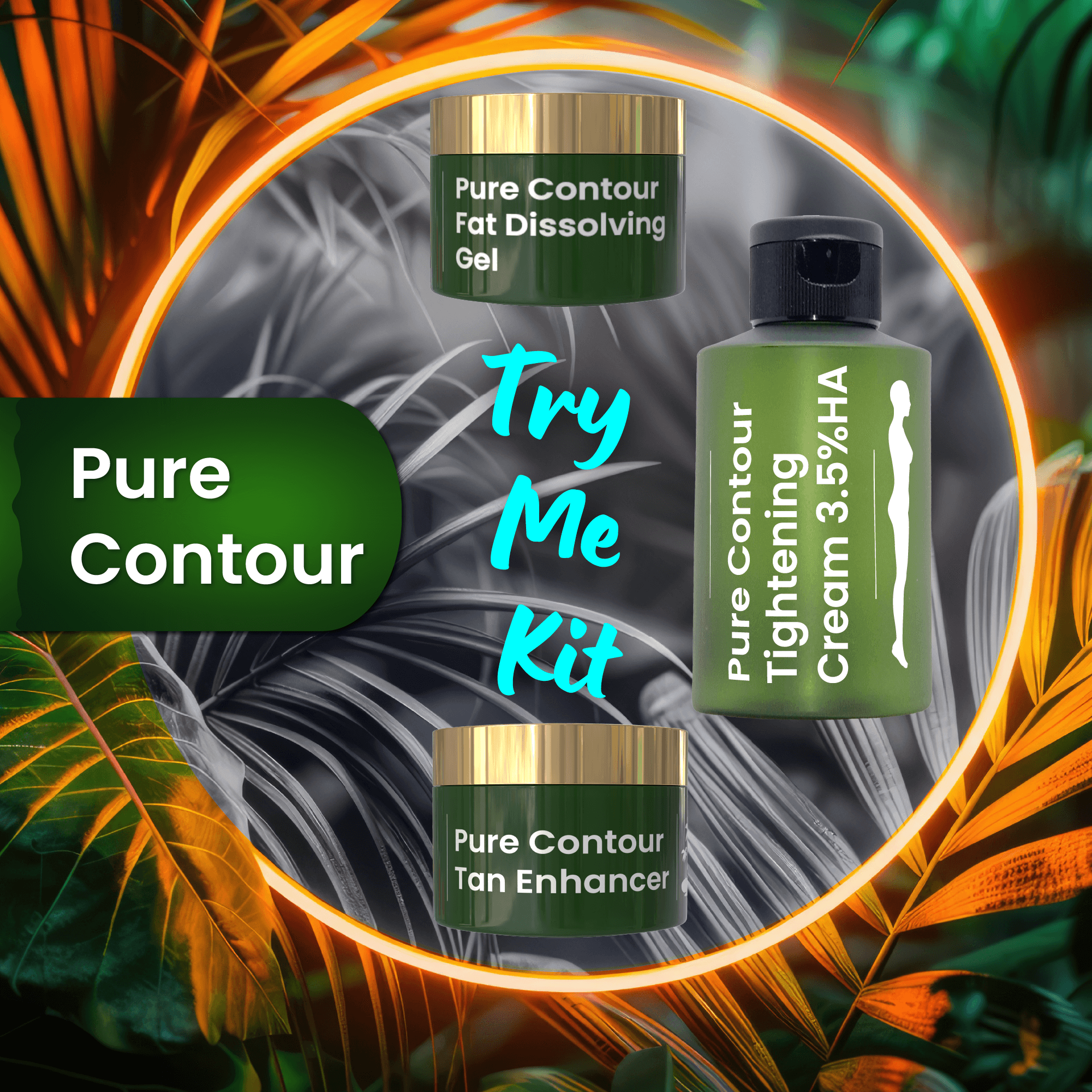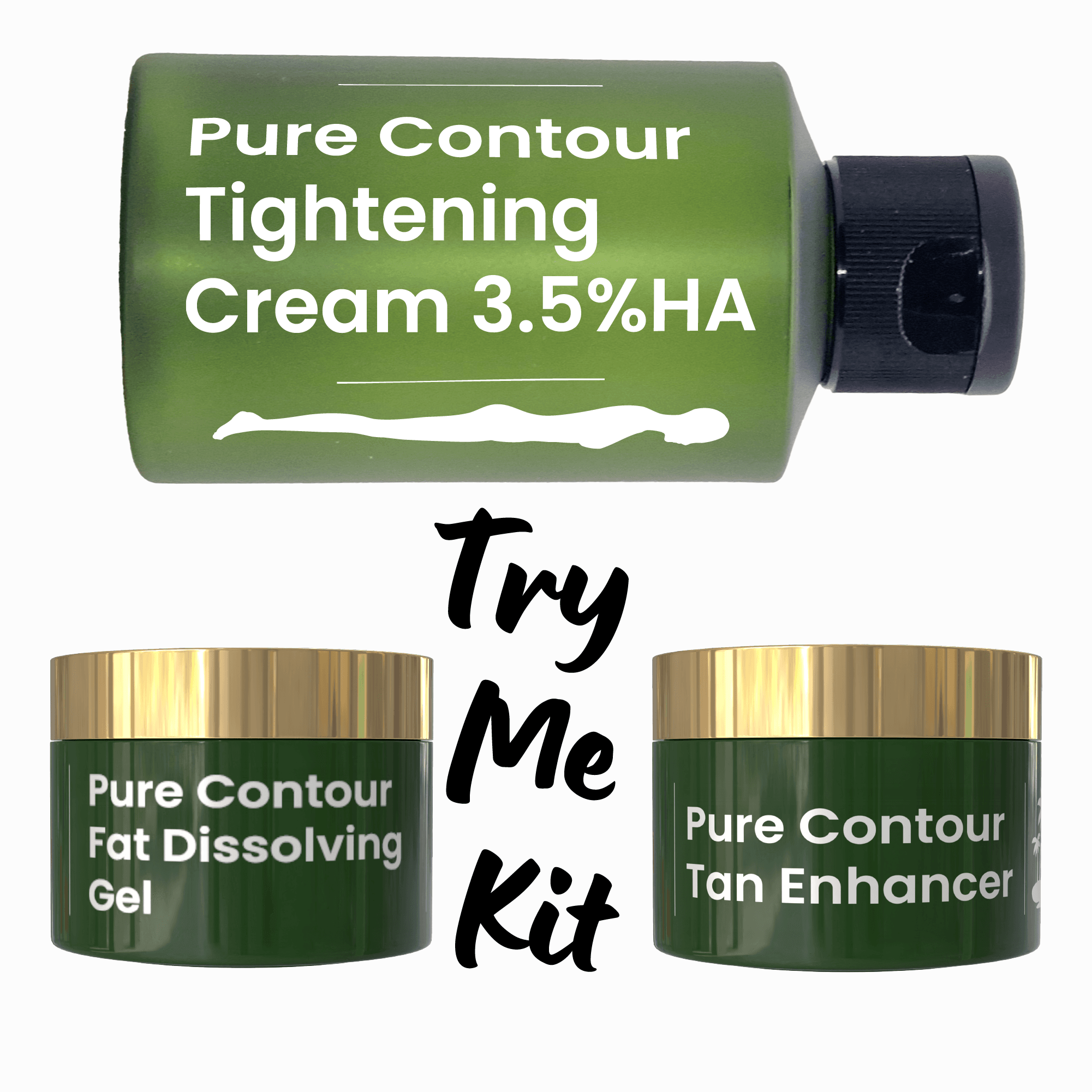 Pure Contour Try Me Kit is an at-home introductory kit designed to give you the full Pure Contour experience. It includes our fat dissolving gel, firming tightening cream, and conditioning tan enhancer at an exclusive 25% introductory saving.